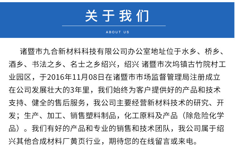 Copyright 2019 www.zjjhxcl.cn 诸暨市九合新材料科技有限公司版权所有 网站备案号:浙ICP备2023052511号“”All Rights Reserved